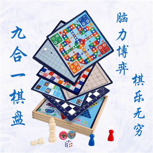 脑力博弈,棋乐无穷! 九款益智棋盘集一身:中国象棋,跳棋,五子棋,飞行棋,军棋,夺宝棋,蛇棋,斗兽棋和国际象棋。 附木制盒方便收纳。