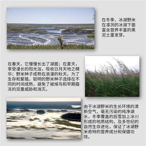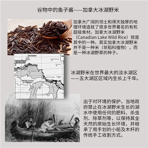 加拿大冰湖野米是世界闻名的有机超级食材。冰湖野米并不是一种米(非稻科植物),而是一种冰湖野草的种子, 在世界最大的淡水湖区 ---- 五大湖区域内生长上千年。冬季,冰湖野米在凛冽的冰湖下富含营养的黑泥土里发芽;在春天,它慢慢长出了湖面;在夏天,享受温长的阳光浴,吸收日月天地之精华;然后,成熟在丰收的秋天。冰湖野米被誉为谷物中的鱼籽酱。